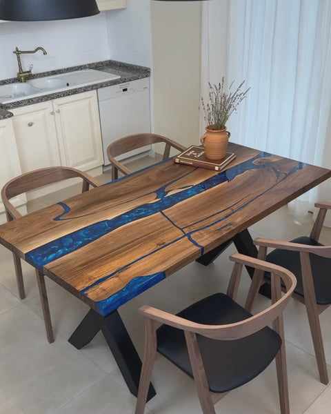 Epoxy Tisch Mezzanotte aus Nussbaum mit blauem Metallic-Harz