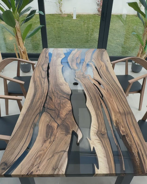 Epoxy Tisch Sinfonia aus Nussbaum massiv mit rauchigem Epoxidharz