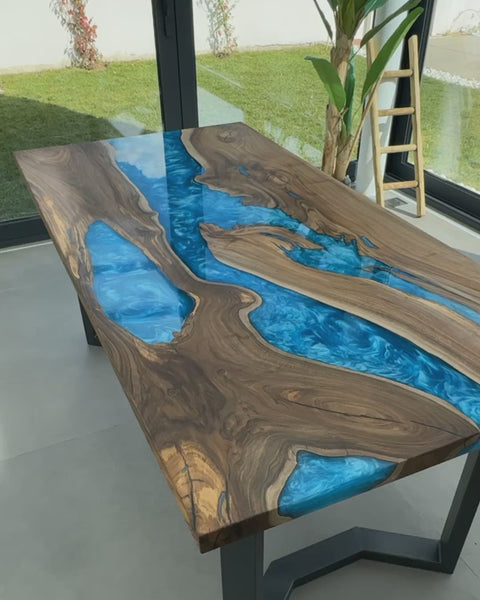 Esstisch Wave aus Nussbaum massiv mit blauem pigmentiertem Epoxidharz