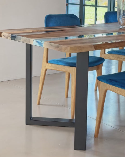 Massivholz Esstisch Sky aus Nussbaum mit blauem und glasklarem Epoxidharz
