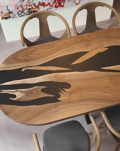 Solid walnut wood epoxy table with black resin, custom size Saphira